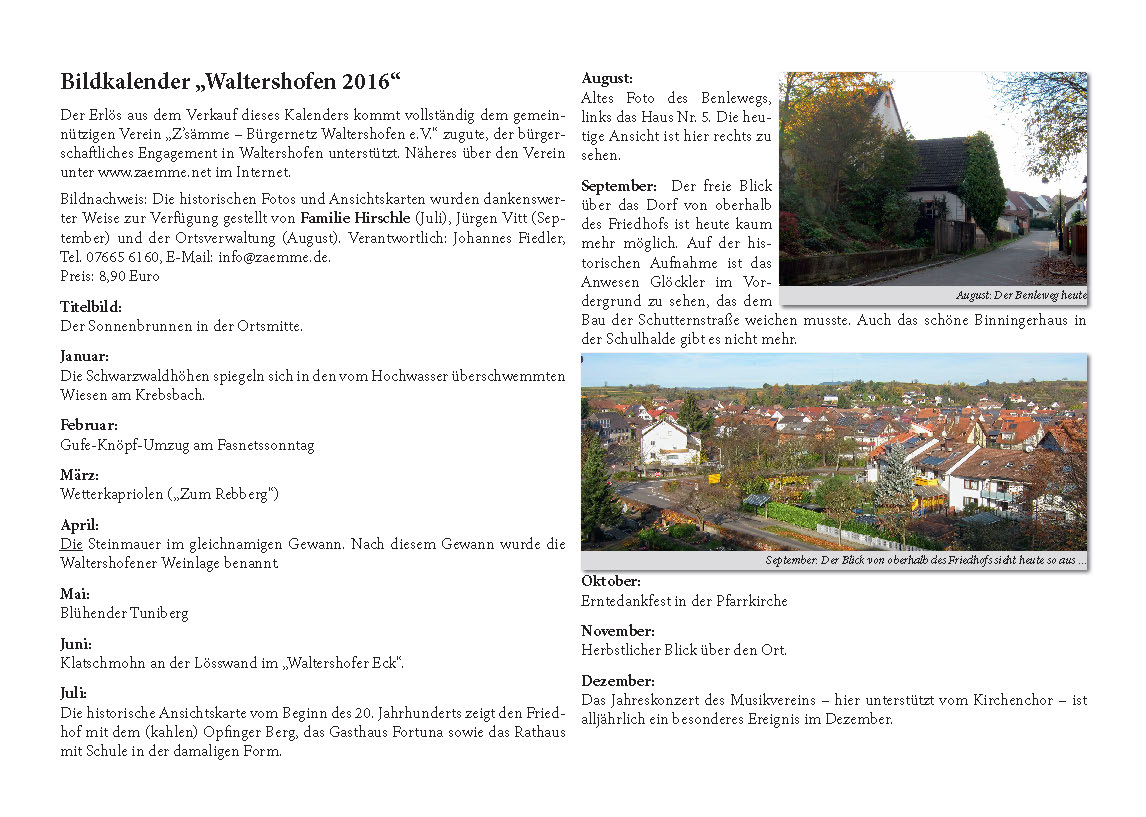 Bildkalender"Waltershofen 2016"Der Bildkalender "Waltershofen 2016" zeigt Fotos aus Waltershofen und dem Tuniberg sowie historischer Aufnahmen und Ansichtskarten. Ein 14. Kalenderblatt gibt Hinweise zu den Bildern und aktuelle Vergleichsfotos zu den historischen Aufnahmen. Der Kalender kann hier im PDF-Format betrachtet werden. Der Kalender bringt ein Stück Verbundenheit mit unserem Dorf zum Ausdruck, der Erlös kommt vollständig dem Bau unseres Begegnungshauses zugute. Hier ein Überblick des Kalenderinhaltes, wer eine genauere Voransicht möchte, kann den Kalender hier im PDF-Format herunterladen (1,7 MB). Die Kalender der vorhergehenden Jahre finden Sie in unserem Kalenderarchiv.