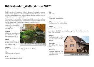 Bildkalender"Waltershofen 2017"Der neue Bildkalender "Waltershofen 2017" mit Fotos aus Waltershofen sowie historischer Aufnahmen und Ansichtskarten ist da! Ein 14. Kalenderblatt gibt Hinweise zu den Bildern und aktuelle Vergleichsfotos zu den historischen Aufnahmen. Der Kalender kann hier im PDF-Format betrachtet und bei den üblichen Verkaufsstellen (s’ Lädeli, Kinder- und Jugendtreff, Friseursalon Siebler, Rathaus, Hänsler's Obst- und Gemüselädele, Familie Fiedler) zum Preis von 8,90 Euro erworben werden oder per E-Mail oder Kontaktformular bestellt werden. Der Kalender bringt ein Stück Verbundenheit mit unserem Dorf zum Ausdruck, der Erlös kommt vollständig dem Bau unseres Begegnungshauses zugute. Hier ein Überblick des Kalenderinhaltes, wer eine genauere Voransicht möchte, kann den Kalender hier im PDF-Format herunterladen (1,6 MB). Die Kalender der vorhergehenden Jahre finden Sie in unserem Kalenderarchiv.