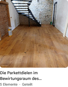 - Die Parkettdielen im Bewirtungsraum des Erdgeschosses sind verlegt und